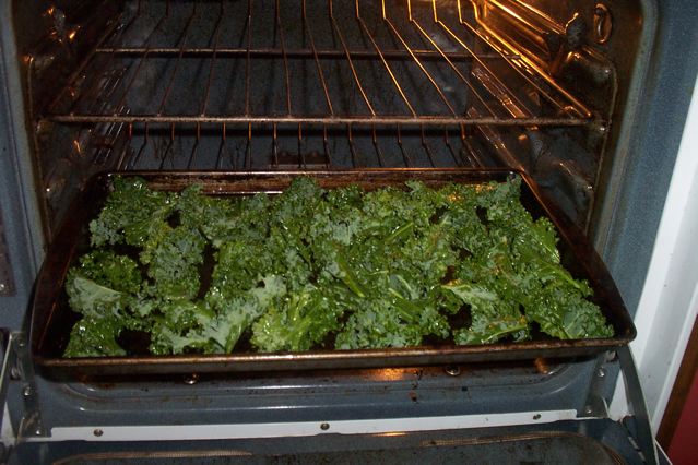 I started by preheating the oven to 275 degrees F. I rinsed several kale leaves, patted them dry and removed the ribs. Then I cut the leaves into 2 inch pieces. Next I added them to a large bowl and drizzled some olive oil (1-2 tbsp) on top. I mixed the greens thoroughly so they were well coated. Finally I lay the kale on a baking sheet and sprinkled them with sea salt. The kale was baked for approximately 15 minutes and ready to serve.