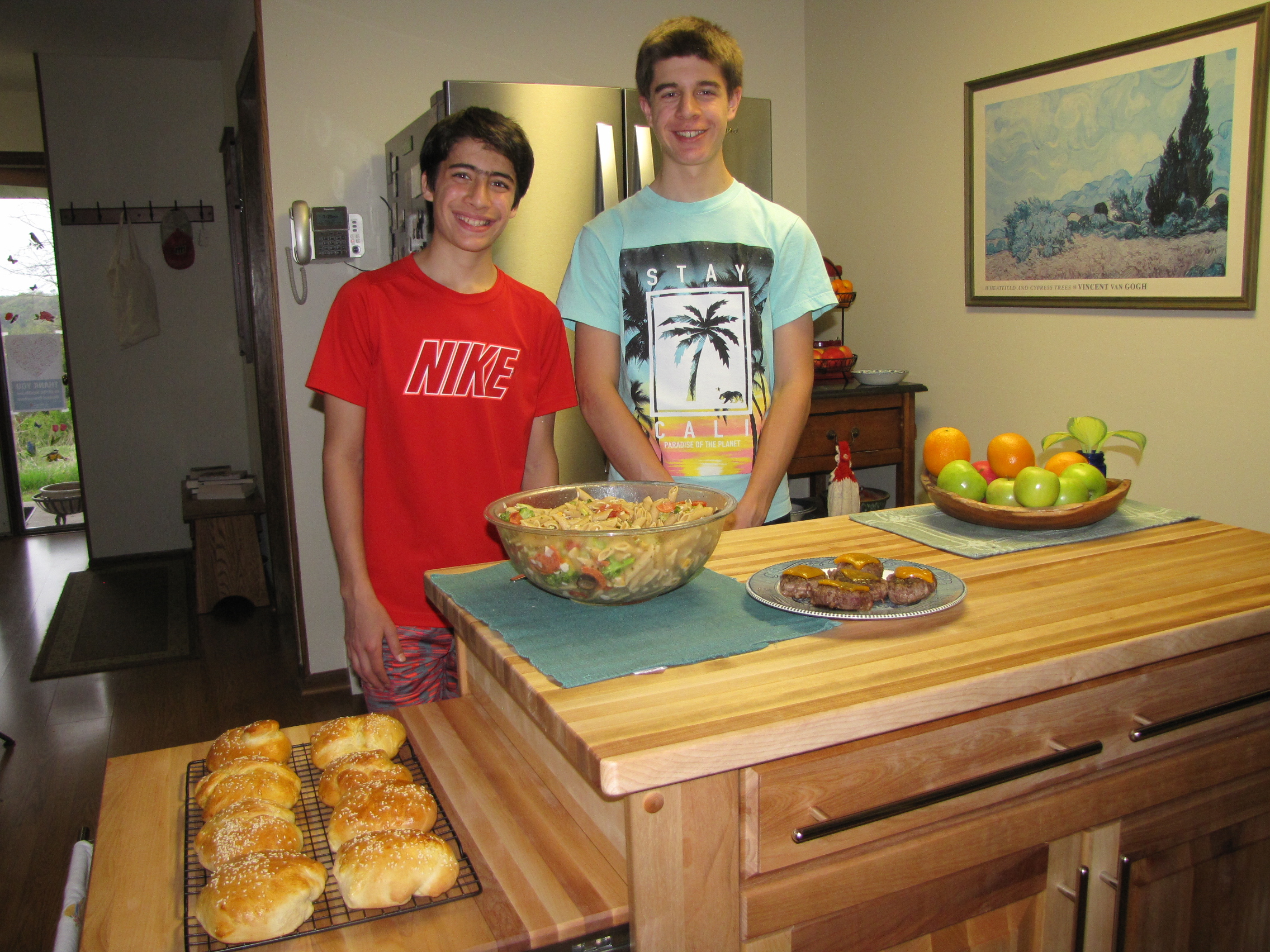With my three boys all being home and doing online school, they have a lot of free time. What better way to fill that free time than with chores :-)  Last weekend, Kyle and Bruce made Pasta Salad, Bison Burgers and Homemade Buns. Everything turned out delicious.  If you’re wondering what Roy was doing . . . he was supervising.