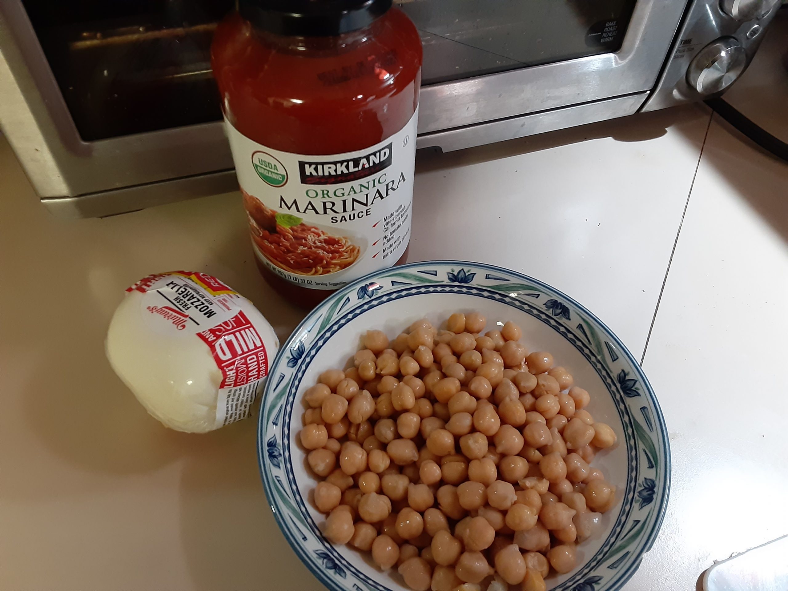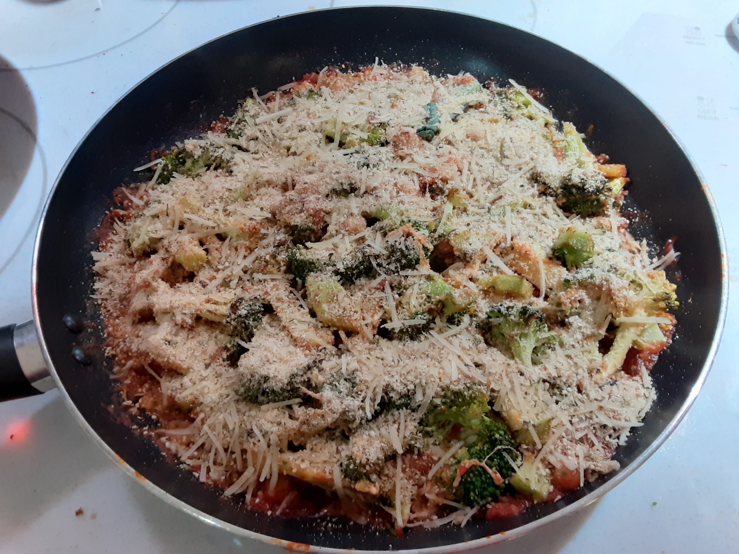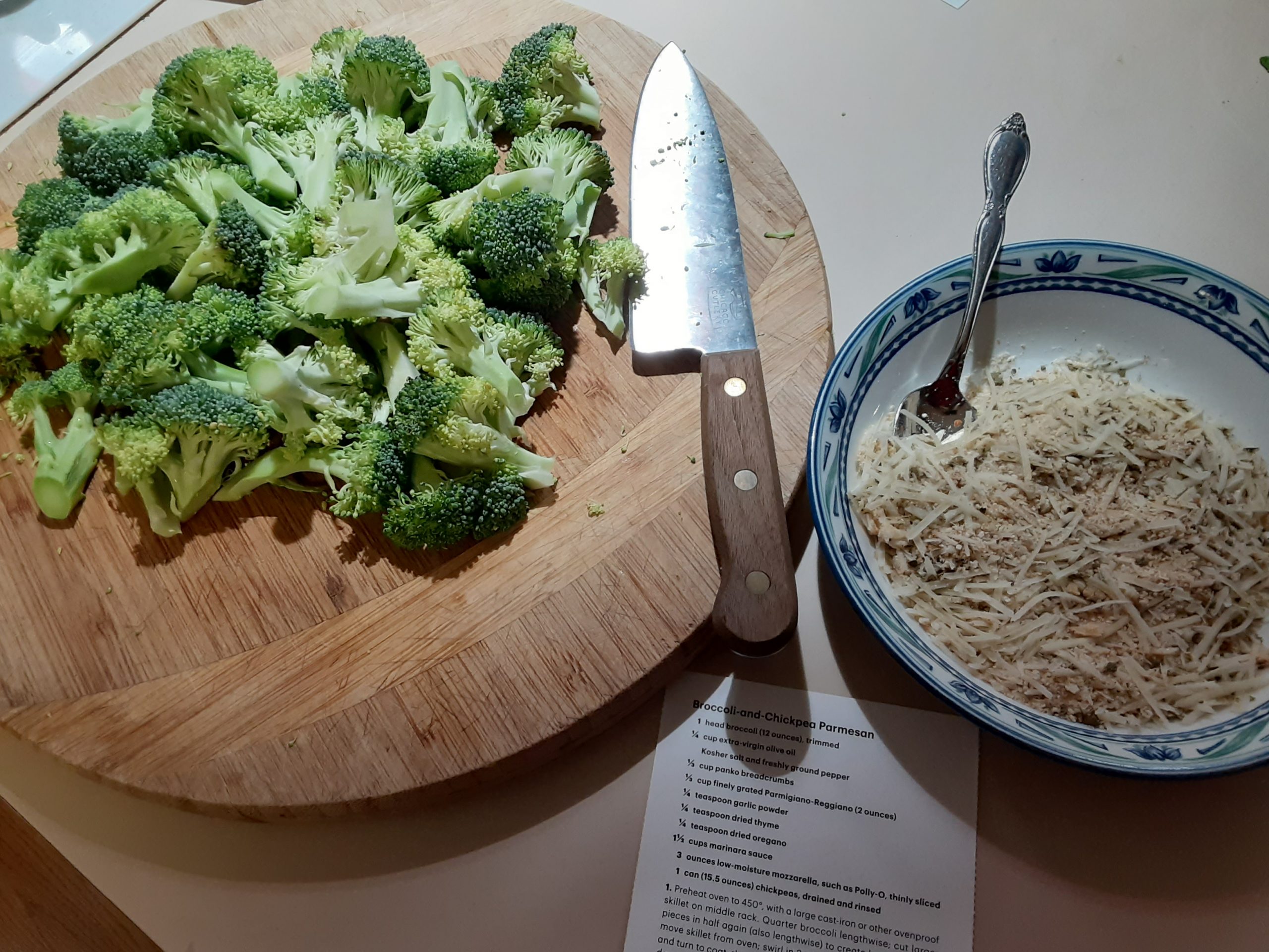 Stir together bread crumbs, Parmesan, garlic, thyme, and oregano. Transfer broccoli to a plate. Add marinara to skillet; top with mozzarella and chickpeas. Return broccoli to skillet, browned-sides up. Sprinkle evenly with bread crumb mixture. Roast until bread crumbs are golden, mozzarella is melted, and sauce is bubbling, about 10 minutes. Remove from oven; let stand 10 minutes. Serve. (*Because my cast iron skillet wasn’t large enough to hold all of the contents, I used a bigger skillet [not oven-proof], added the ingredients and finished the dish off on the stove top instead of the oven. The Parmesan cheese did melt but the bread crumbs did not get golden. No biggie.)