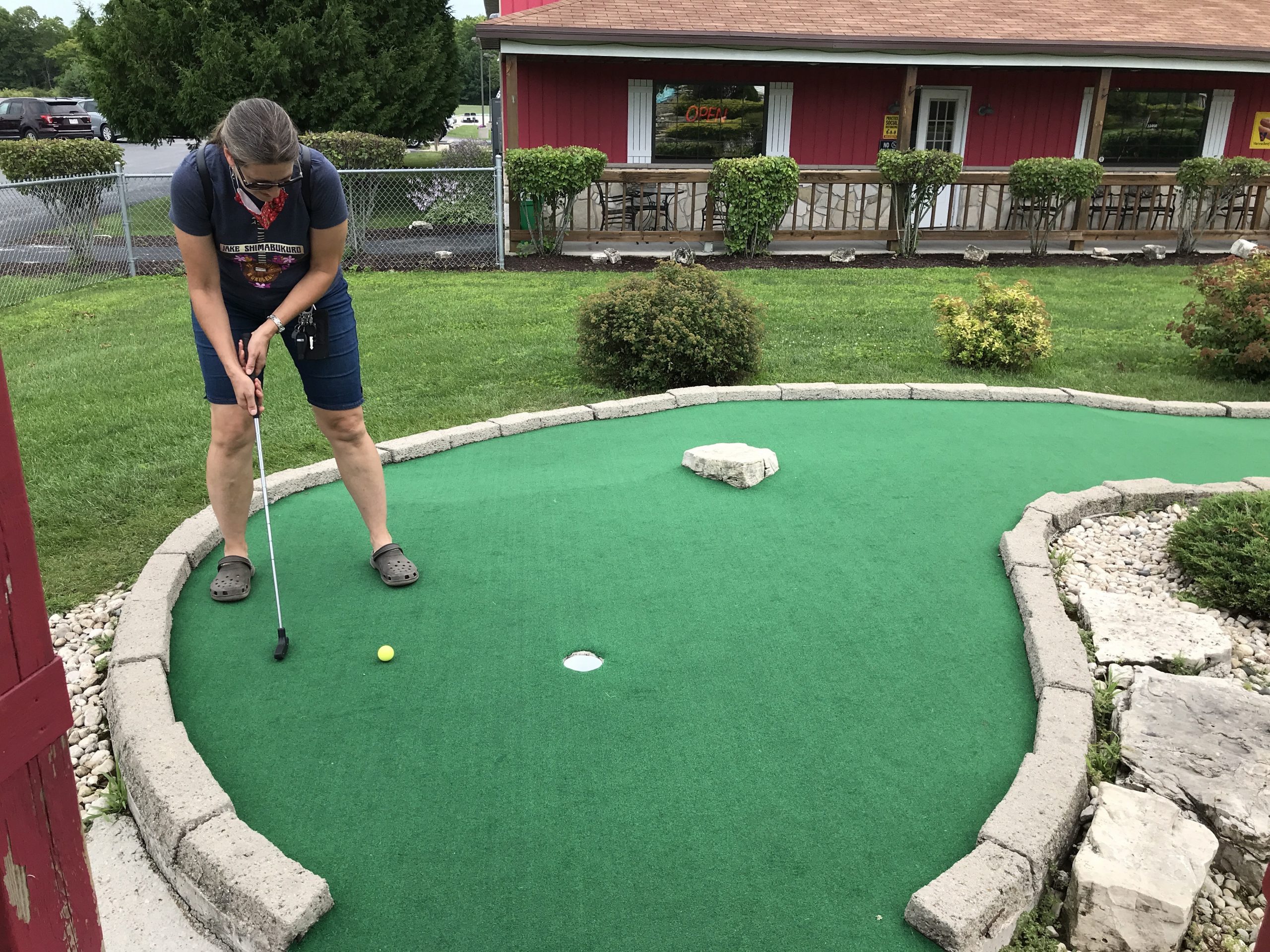 Heather shows off her mini-golf putting skills.